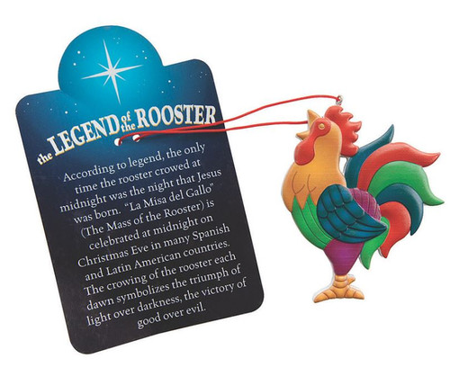 This colorful Resin Rooster Ornament symbolizes the Legend of the Rooster and comes with its own card, detailing the story of the Rooster on Christmas night known in In Spanish and Latin America countries as “Misa del Gallo,” the Mass of the Rooster. It is the story of the first crow of a rooster the night Jesus was born. According to the legend, roosters now crow at the dawn of each day as a celebration of light over darkness.