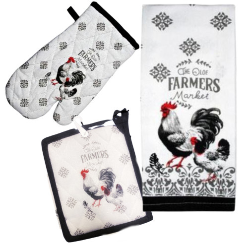 The set includes one 15x25" towel, one Oven Mitt 7x12" and one Potholder 7x7", 100 % Cotton. Machine wash cold.