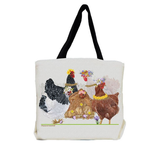 Every Chicken Lover on the go needs a colorful Canvas Tote, and this one's for the Mama Hens! Ideal for the farmers market, shopping or travel to show off your country style. Whimsical Hens with Flower Crowns and Baby Chicks, this carryall will make any Chickenlover smile. Original artwork by Mary Badenhop.