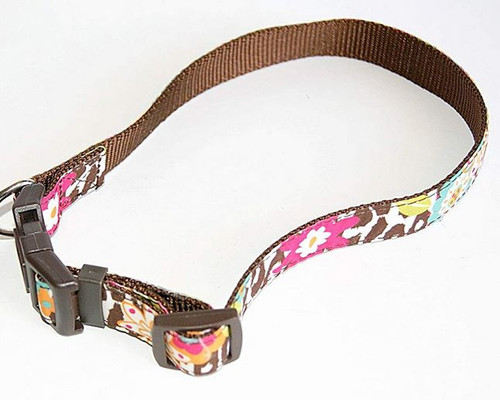 Petmate Chloe Brown Floral Adjustable collar measures 16" - 26', with Quick Snap Buckle. Floral theme on brown and cream animal print background stitched on brown Nylon Collar. Size Large.