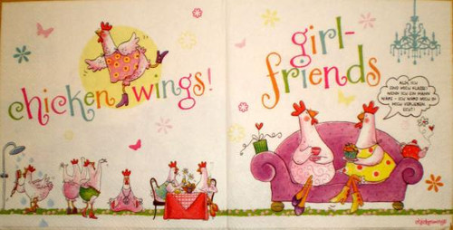 These artsy and funky Paper Napkins feature "the girls" having tea and showing off their Chicken Wings. Hens, Chickens = Girlfriends super cute Lunch Paper Napkins by Ambiente. Printed on responsibly sourced paper, printed with environmentally safe paints, brilliant colors. Decorate your table for a special occasion or just bring a smile to someones face with these funny napkins. Made in Germany by Ambiente Luxury