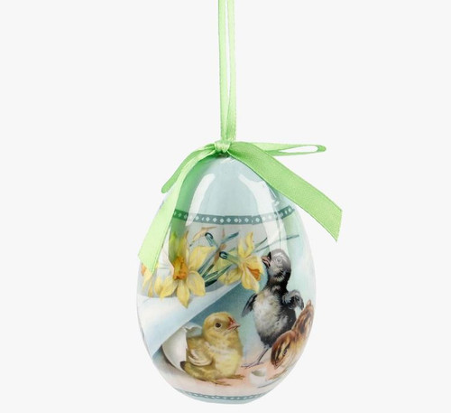 Nostalgia at its finest - this large Easter Egg Decoration in Vintage look is decorated with freshly hatched chicks and Daffodils. 5" high, 8 1/4" in diameter. Made in Germany.