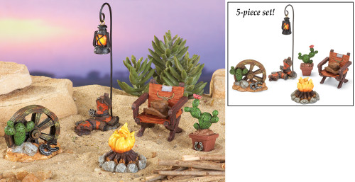 Create a true Soutwest Western Theme Miniature Garden with this delightful set of 5 pcs. The set includes a campfire, cactus, wagon wheel, chair and lamppost complete with a pair of Cowboy boots underneath it. Add some sand and a cactus and you will have a neat little Arizona mini landscape.